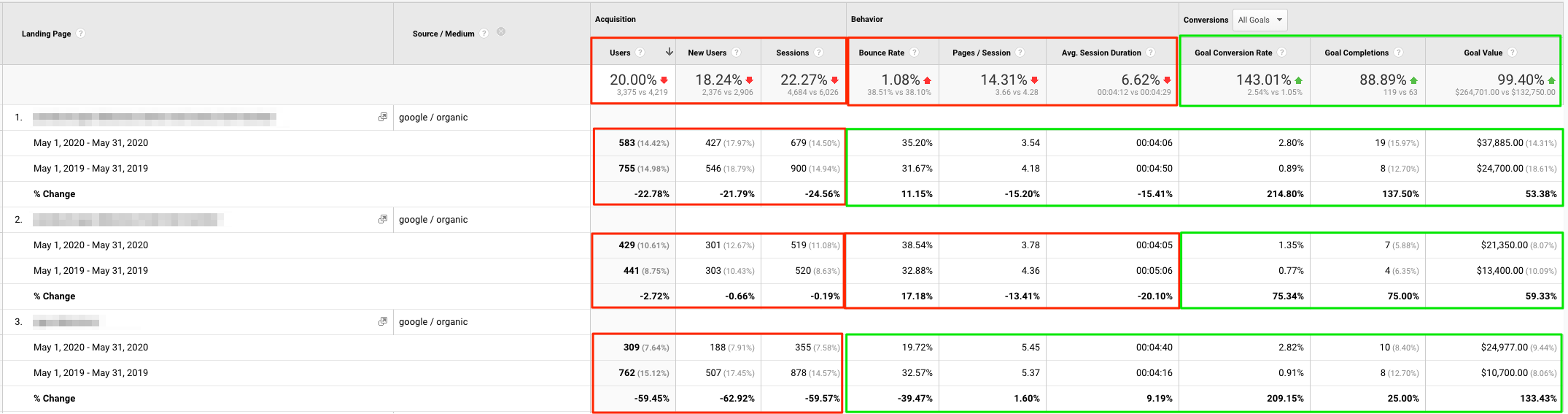Overall, Acquisition and Behavior metrics are down for this content strategy while Conversion metrics are up. Looking at the Top 3 pages, each saw a decrease in Acquisition, but saw increases in Conversions. Two of three also saw an increase in Behavior.